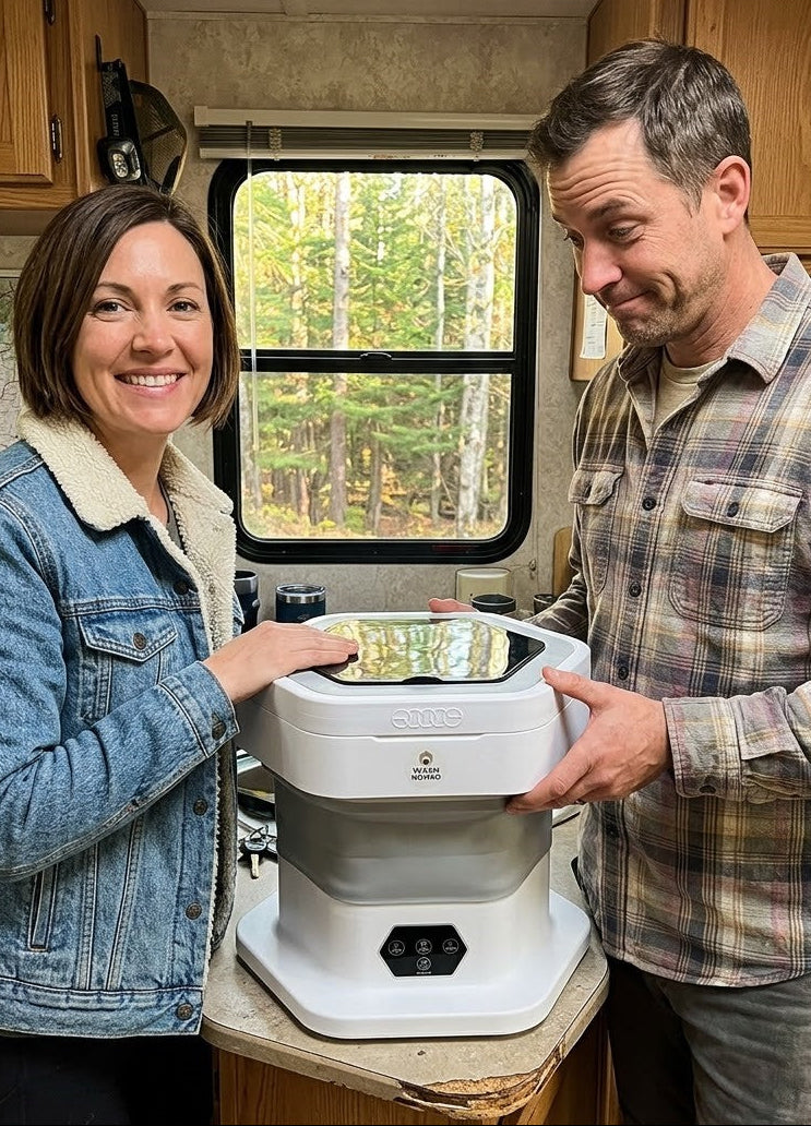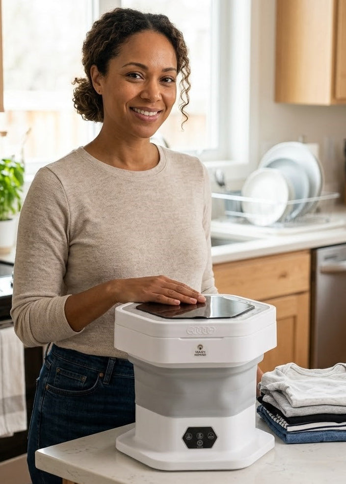 No plumbing or installation is required. Simply unfold the washer, add water and detergent, then press start. It is designed to work anywhere, making it ideal for apartments, dorms, travel or small spaces.
